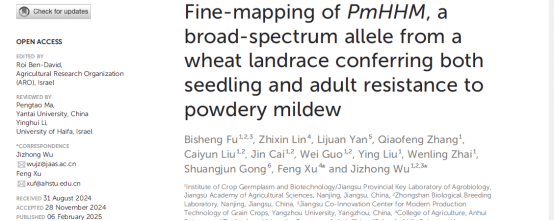 (1) Bisheng Fu, Zhixin Lin, Lijuan Yan, Qiaofeng Zhang, Caiyun Liu, Jin Cai, Wei Guo, Ying Liu, Wenling Zhai, Shuangjun Gong, Feng Xu* and Jizhong Wu*. Fine-mapping of PmHHM, a broad-spectrum allele from a wheat landrace conferring both seedling and adult resistance to powdery mildew. Frontier in Plant Science. 2025, 15:1489013.