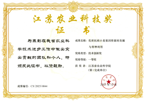 种质资源是小麦育种的基础,成果针对我国南方麦区病害频发、生态条件不利于强筋小麦蛋白质积累和小麦面制品易褐变等问题,围绕我省对抗病、优质小麦品种需求,在国家重点研发计划等项目的资助下,按照“资源筛选—基因发掘—种质创新—共享利用”的技术路线,发掘优异种质资源,创制优质抗病新种质为育种提供可直接利用亲本,在突破育种亲本遗传基础狭窄、种质资源高效育种利用等方面取得了实质性进展。授权国家发明专利6项,获得植物新品种权10项,自主育成小麦新品种8个,发表论文20篇(其中SCI论文14篇)。1. 研制了小麦重要病害鉴定的新技术,提高了小麦病害鉴定的准确性;鉴定筛选出优质、抗病种质资源150份,为优质抗病种质创新和品种选育提供了资源支撑。2. 对发掘的优异种质资源进行遗传解析,定位优质、抗病新基因/QTL 12个,自主克隆抗病基因4个并开发了诊断性分子标记,将优异种质资源转化为育种可利用基因资源。3. 利用发掘的优异种质和基因资源,结合分子标记辅助选择和人工气候室加代的快速种质创新技术,创制了目标性状突出的优质抗病小麦新种质29份,其中8份新种质通过国家和省级品种审定,为小麦优质抗病育种提供了可直接利用的亲本。4. 向60家科研院所共享服务了优异小麦种质与创新材料,利用共享资源育成小麦新品种35个,累计推广面积5000多万亩,社会、经济和生态效益显著。