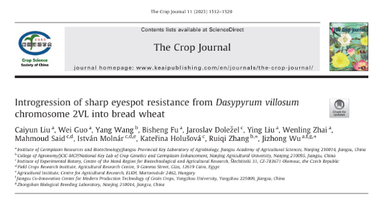 (4) Caiyun Liu, Wei Guo, Yang Wang, Bisheng Fu, Jaroslav Doležel,Ying Liu, Wenling Zhai, Mahmoud Said, István Molnár, Kateřina Holušová, Ruiqi Zhang, Jizhong Wu*. Introgression of sharp eyespot resistance from Dasypyrum villosum chromosome 2VL into bread wheat. The Crop journal. 2023, 11:1512-1520.