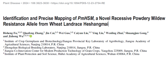 (2) Bisheng Fu, Qiaofeng Zhang, Jin Cai, Wei Guo, Caiyun Liu, Ying Liu, Wenling Zhai, Shuangjun Gong, and Jizhong Wu*. Identification and Precise Mapping of PmHSM, a Novel Recessive Powdery Mildew Resistance Allele from Wheat Landrace Heshangmai. Plant Disease. 2024, 108:3623-3630.