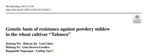 (5) Jizhong Wu, Haiyan Jia, Linyi Qiao, Bisheng Fu, Gina Brown-Guedira, Ragupathi Nagarajan, Liuling Yan*. Genetic basis of resistance against powdery mildew in the wheat cultivar “Tabasco”. Molecular Breeding. 2023, 43:56.