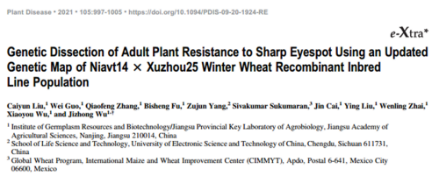 (8) Caiyun Liu#, Wei Guo#, Qiaofeng Zhang, Bisheng Fu, Zujun Yang, Sivakumar Sukumaran, Jin Cai, Ying Liu, Wenling Zhai, Xiaoyou Wu, Jizhong Wu*. Genetic Dissection of Adult Plant Resistance to Sharp Eyespot Using an Updated Genetic Map of Niavt14 × Xuzhou25 Winter Wheat Recombinant Inbred Line Population. Plant Disease. 2021, 105.4: 997-1005