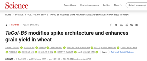 (6) Xiaoyu Zhang, Haiyan Jia, Tian Li, Jizhong Wu, Ragupathi Nagarajan, Lei Lei, Carol Powers, Chia-Cheng Kan, Wei Hua, Zhiyong Liu, Charles Chen, Brett F. Carver, Liuling Yan*. TaCol-B5 modifies spike architecture and enhances grain yield in wheat. Science, 2022,376:180-183.