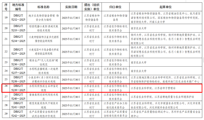 近日,江苏省市场监督管理局发布2025年第11号(总第238号)公告,正式批准《水稻实质性派生品种鉴定规程》(DB32/T 5239-2025)江苏省地方标准自2025年11月30日起实施。该标准由农业农村部植物新品种测试南京分中心联合江苏省种子管理站共同研制完成。