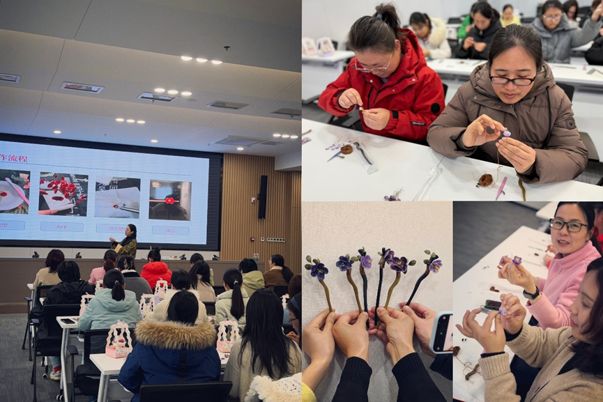 在随后的手工沙龙活动中,绒花手工老师通过PPT演示,为女职工讲解绒花的历史背景、文化寓意、制作工艺等知识,重点介绍了绒花发簪的制作要点与操作注意事项,让大家对这一非遗项目有了全面了解。手工制作环节,女职工们以小组为单位,在老师的现场巡回指导下,动手制作绒花发簪。大家相互交流、潜心创作,在绕绒和定型过程中感受手工乐趣,一件件独具巧思的绒花发簪作品逐渐成型,现场氛围轻松愉悦、暖意融融。