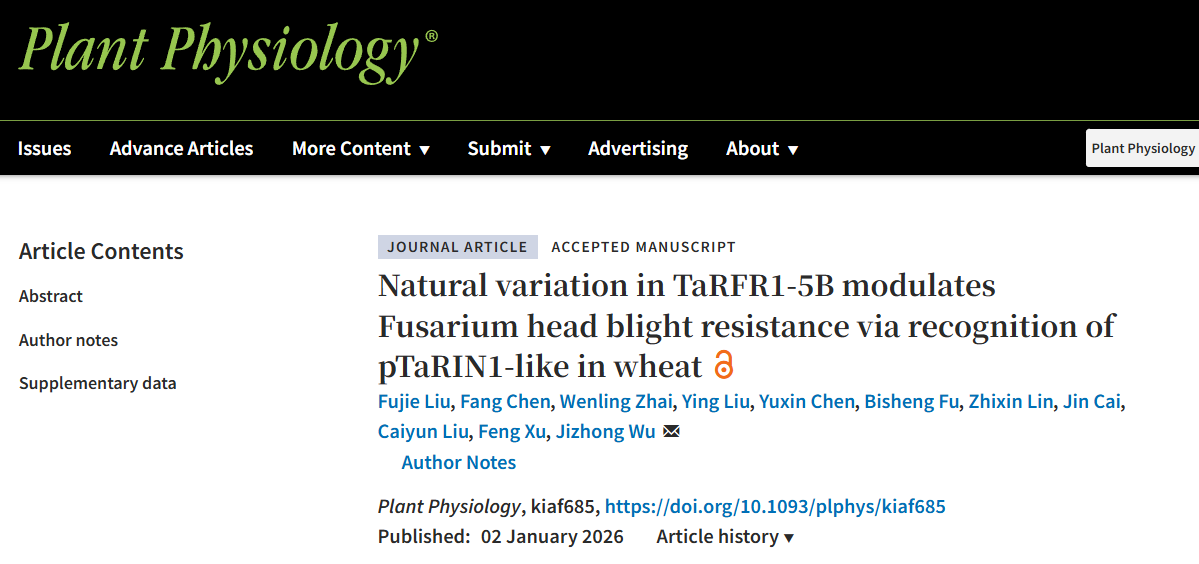 2026年1月2日,资源所小麦种质资源创新团队在国际知名学术期刊《Plant Physiology》在线发表题为“Natural variation in TaRFR1-5B modulates Fusarium head blight resistance via recognition of pTaRIN1-like in wheat”的研究论文。该研究通过全基因组关联分析(GWAS)在小麦自然群体中鉴定并验证了一个编码CC-NBS-LRR蛋白的抗赤霉病基因,研究还进一步揭示了该基因的精细分子调控机制。TaRFR1-5B通过其LRR结构域直接识别被病原菌侵染后磷酸化的免疫调节蛋白TaRIN1-like,从而激活下游的活性氧爆发和细胞死亡等免疫反应。一个关键氨基酸的自然变异(Leu533Ser)决定了TaRFR1-5B蛋白与磷酸化TaRIN1-like的结合亲和力,从而导致了小麦对赤霉病抗性的差异。